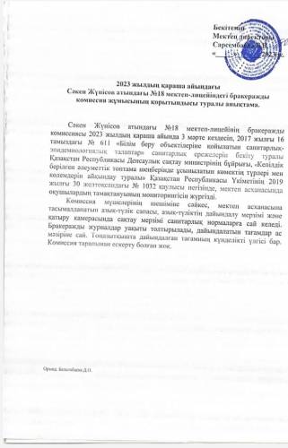 Информация об итогах работы комиссии брокерской комиссии в школе-лицее № 18 имени Сакена Жунисова в ноябре 2023 года